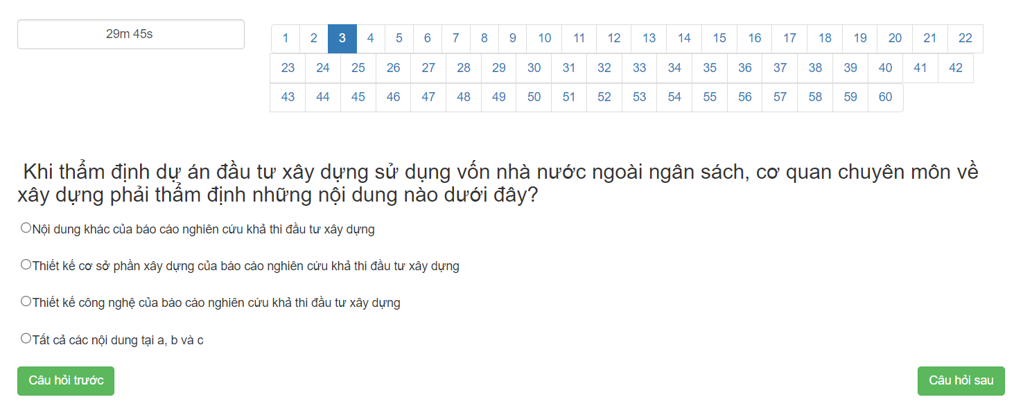 Thi : Khi thi online hệ thống sẽ ghi lại từng bước trạng thái làm bài, từng câu trả lời của thí sinh. Nếu có mất điện kết quả cũng sẽ cập nhật tại thời điểm làm bài cuối cùng. Kết quả thi online xem trực tiếp ngay sau khi làm bài. Kết quả làm bài thông báo rõ đâu là câu trả lời thí sinh, đâu là câu trả lời đúng. Câu hỏi này có được điểm hay mất điểm. Xem được lại kết lý do sai đúng.